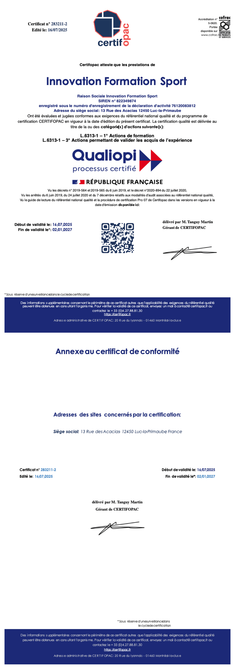 Innovation Formation Sport a obtenu sa certification en 2021 et a souhaité au travers de cette démarche valoriser les processus et la qualité de l'enseignement dispensé lors des sessions de formations individuelles et collectives. Un organisme basé sur Rodez (Aveyron) mais qui se veut itinérant, et ce, sur toute la France.