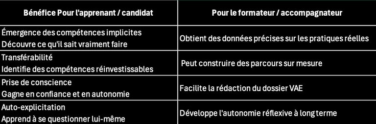 Pour le formateur, c'est un outil de débriefing et d'analyse de pratiques d'une richesse incomparable. Pour l'accompagnateur VAE, c'est le levier qui transforme une expérience vécue en dossier de compétences solide. Pour le facilitateur, c'est une façon de créer un espace de parole authentique, ancré dans le réel plutôt que dans les représentations.